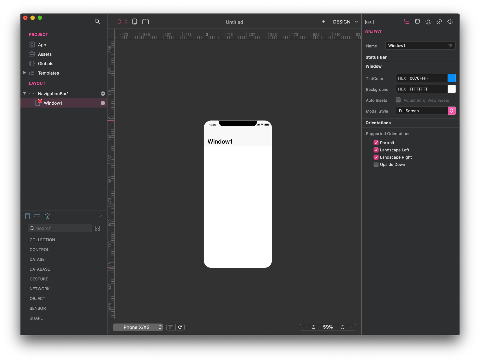 We don't need a Navigation Bar for this app, so let's move the default window created by Creo outside the NavigationBar1 element, delete NavigationBar1, and keep the Window1 container instead.