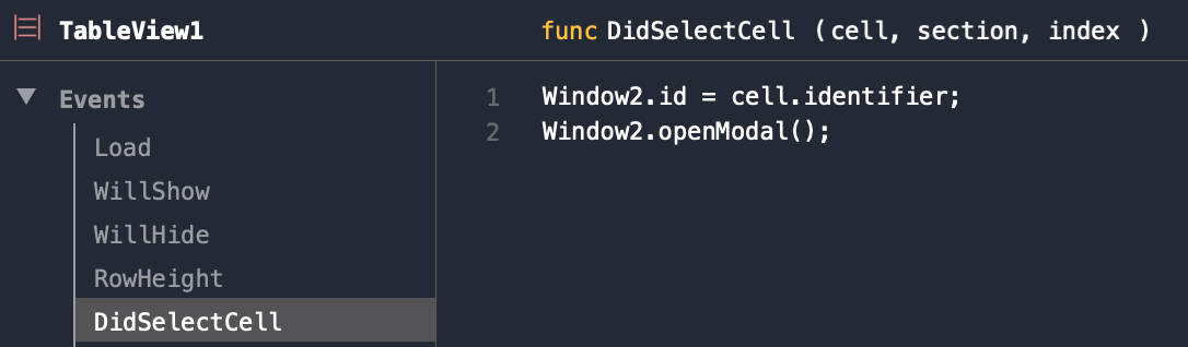 To display Window2 every time the user tap on a logline, we need to manage the DidSelectCell event of the TableView1 control. There we can pass any parameters to Window2: