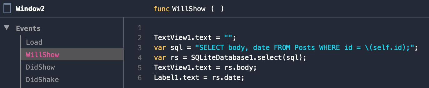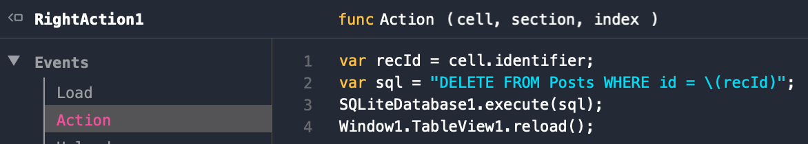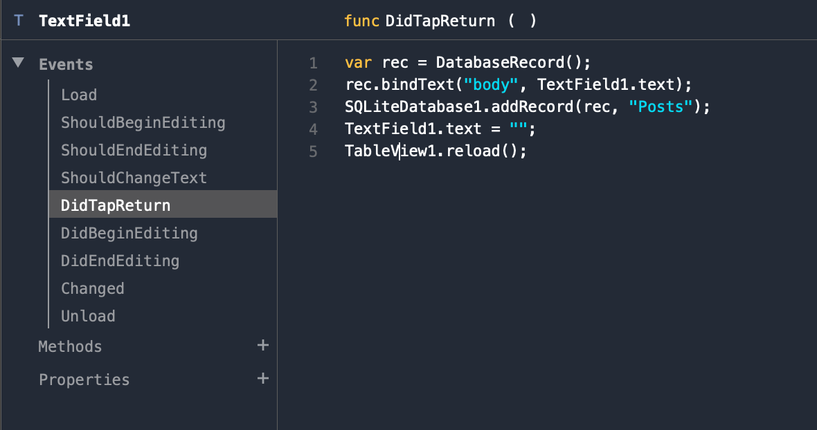 We define a variable as a DatabaseRecord and then we bind one of the Posts table attributes— body —to the TextField1 value. Then we add this record to the Posts table, clean up TextField1 content, and reload the Table View.