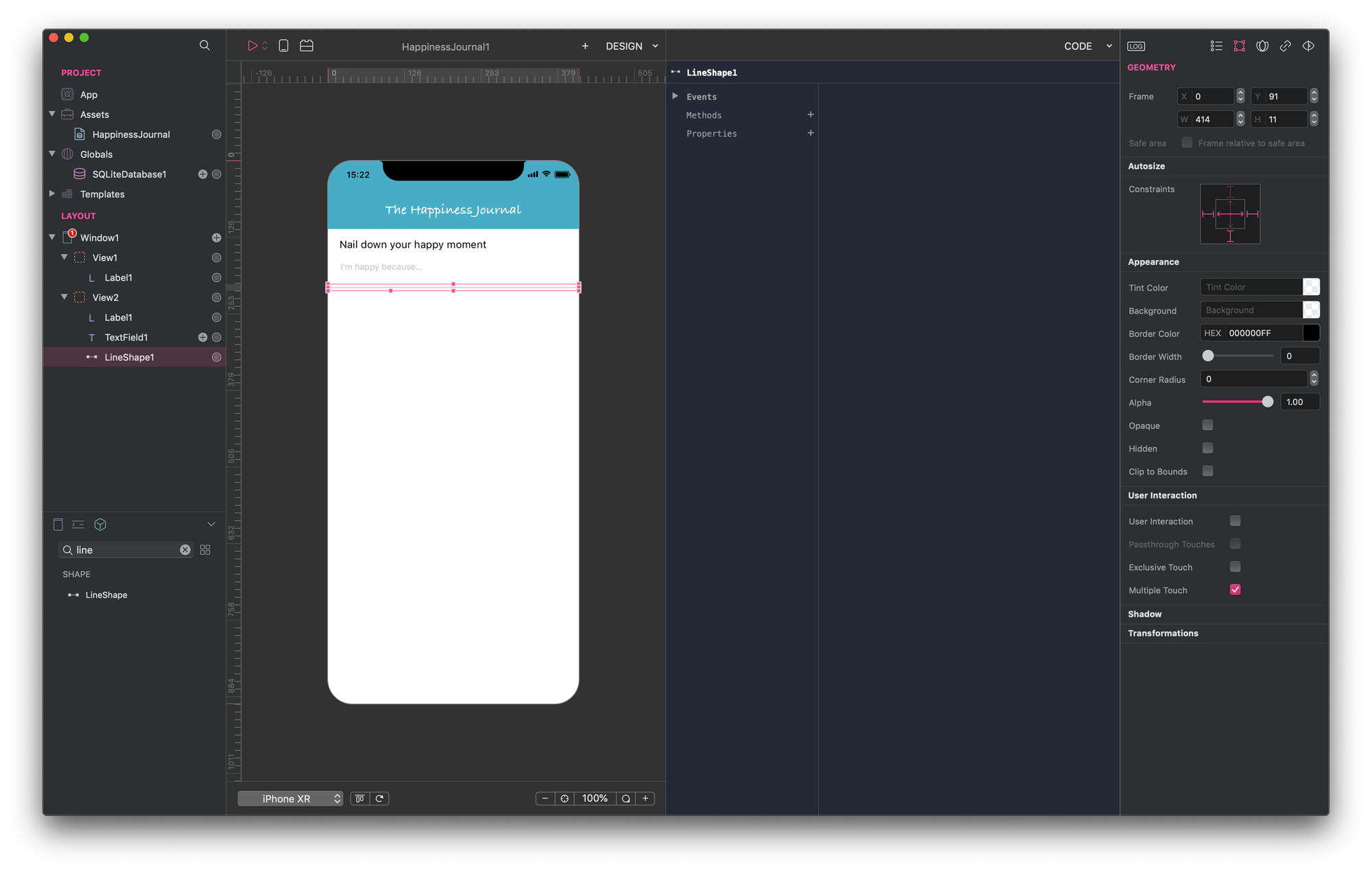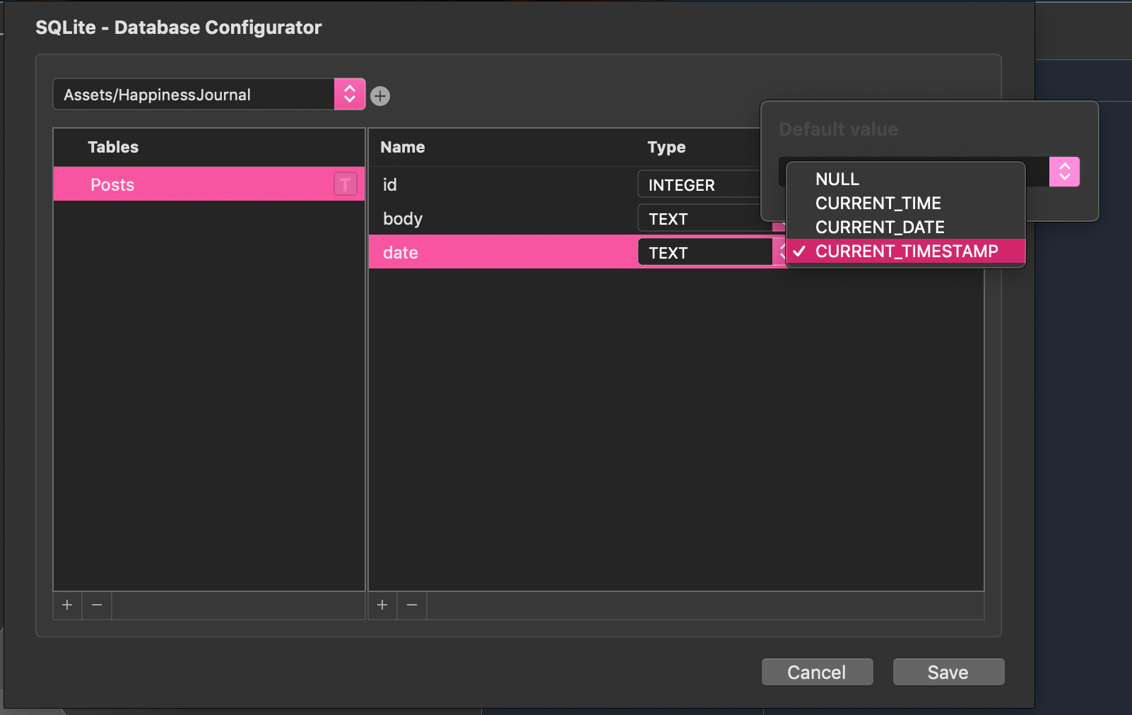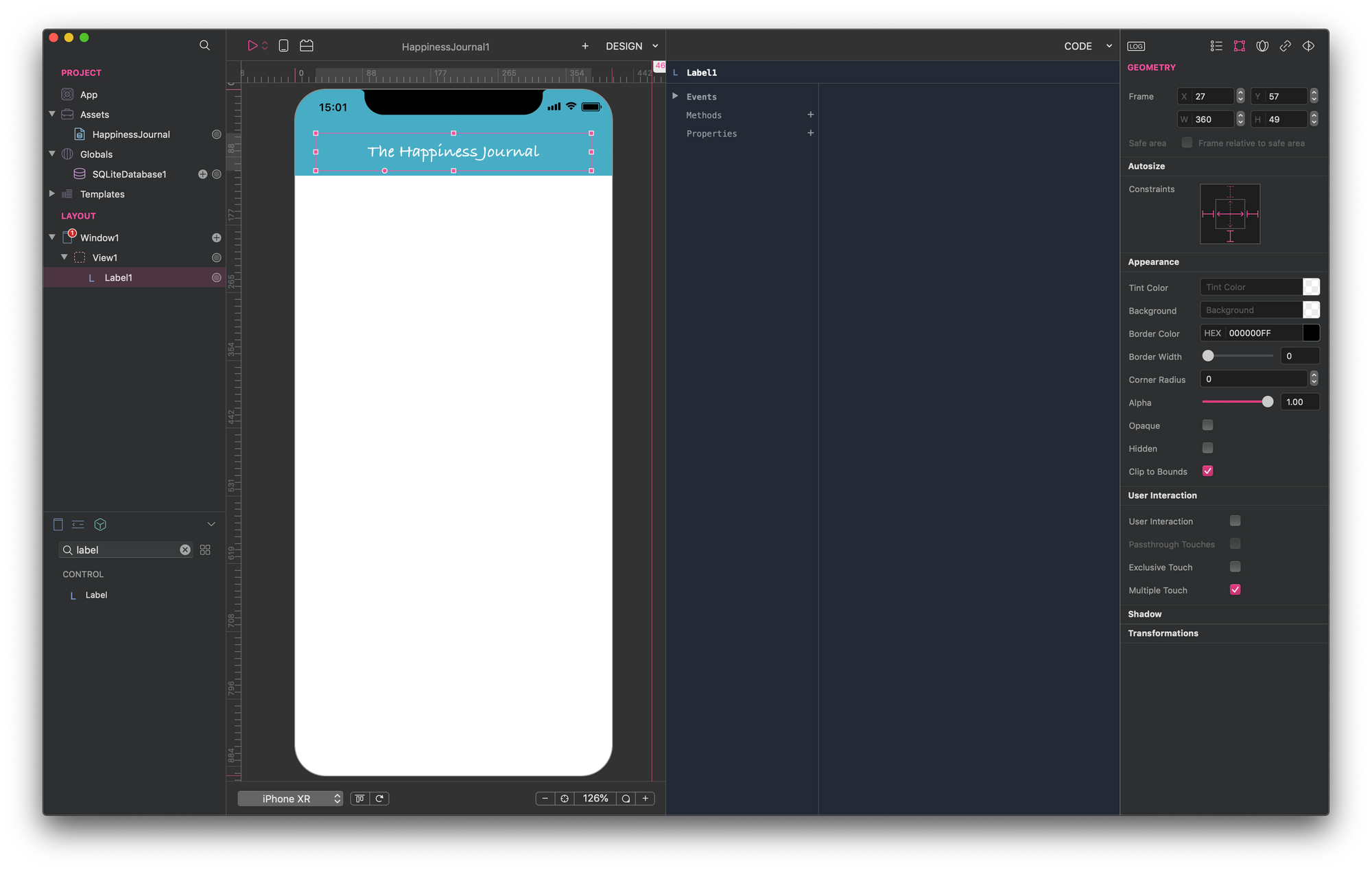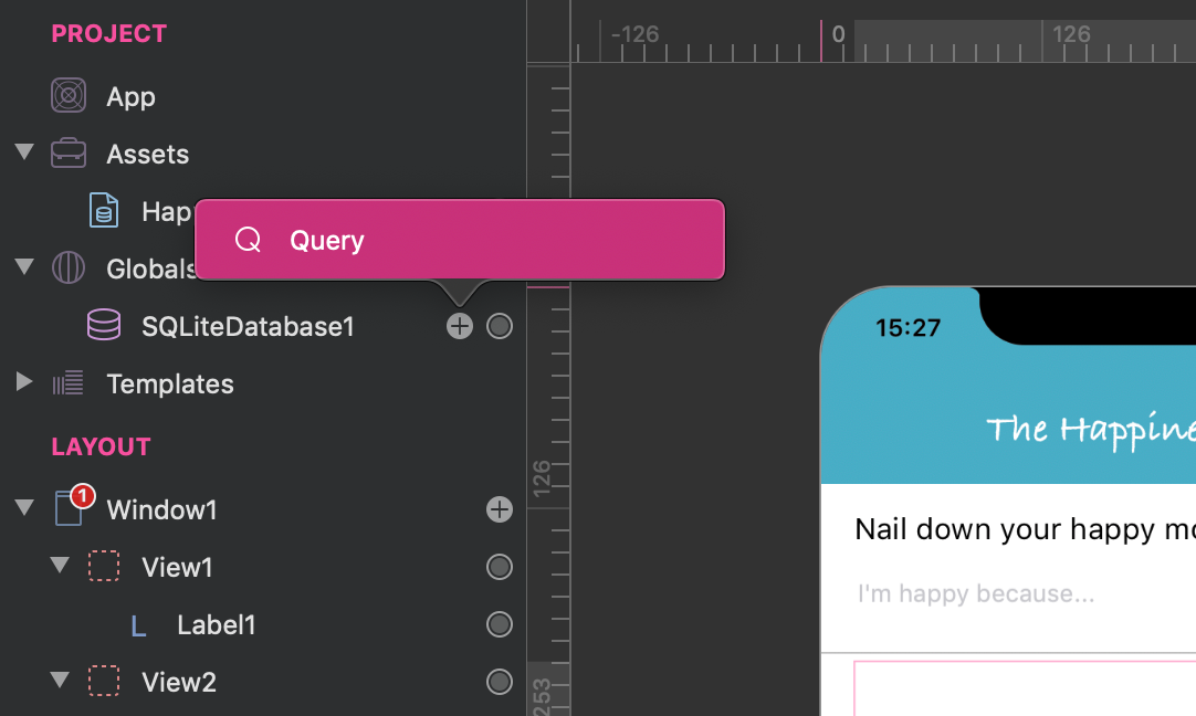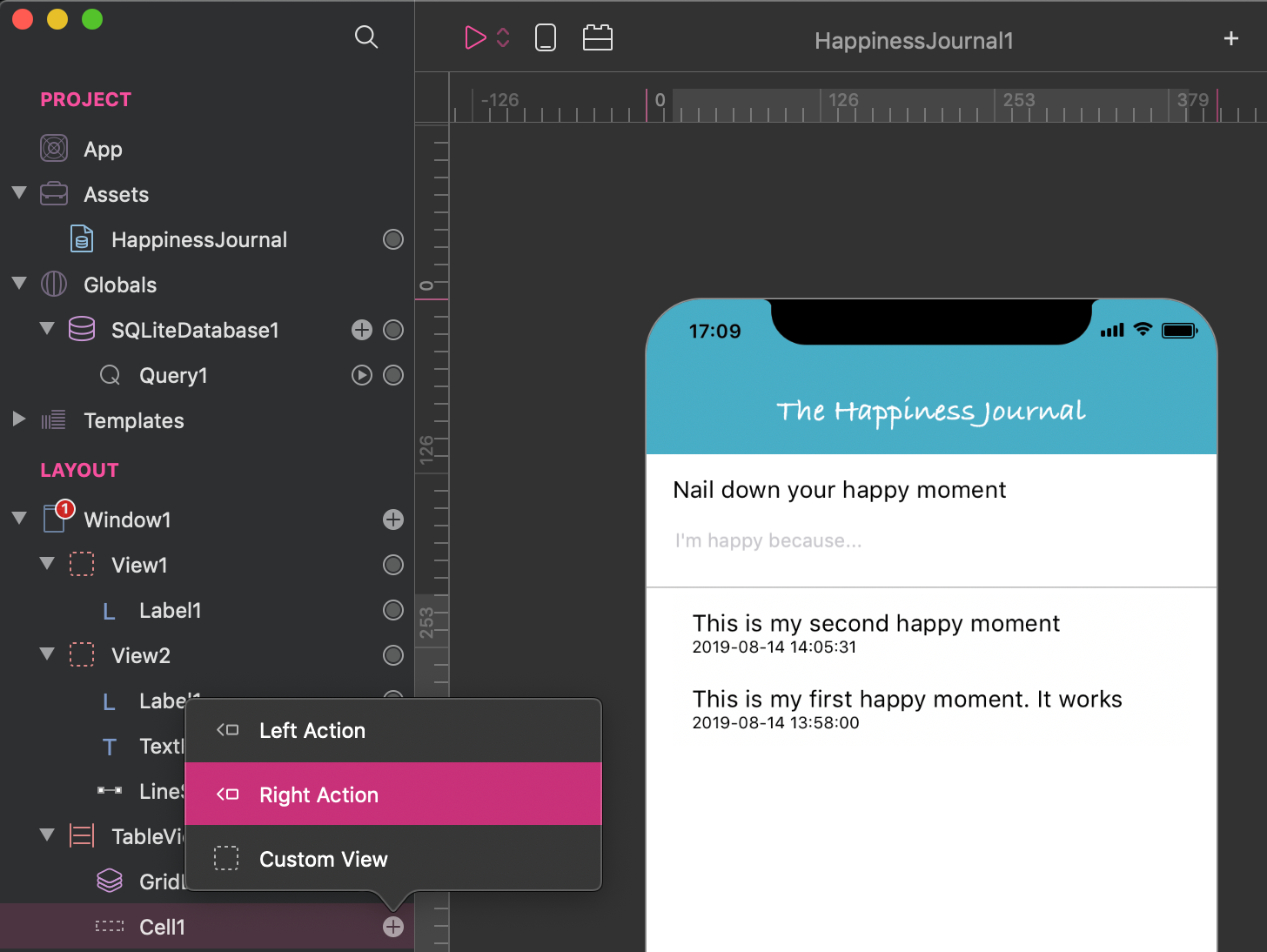 When we save our database, a new object is added to Globals — SQLiteDatabase1. We use this object to interact with the Happiness Journal database globally in the application.