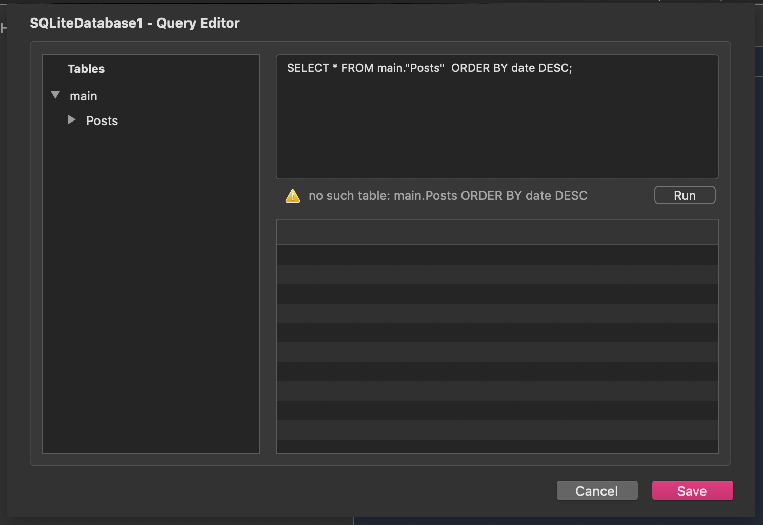We open the Query Editor from the Object Inspector, then we drop the Posts table on the query area. Because we want to get loglines in reverse order, we add ORDER BY date DESC to the original query and we get this one: