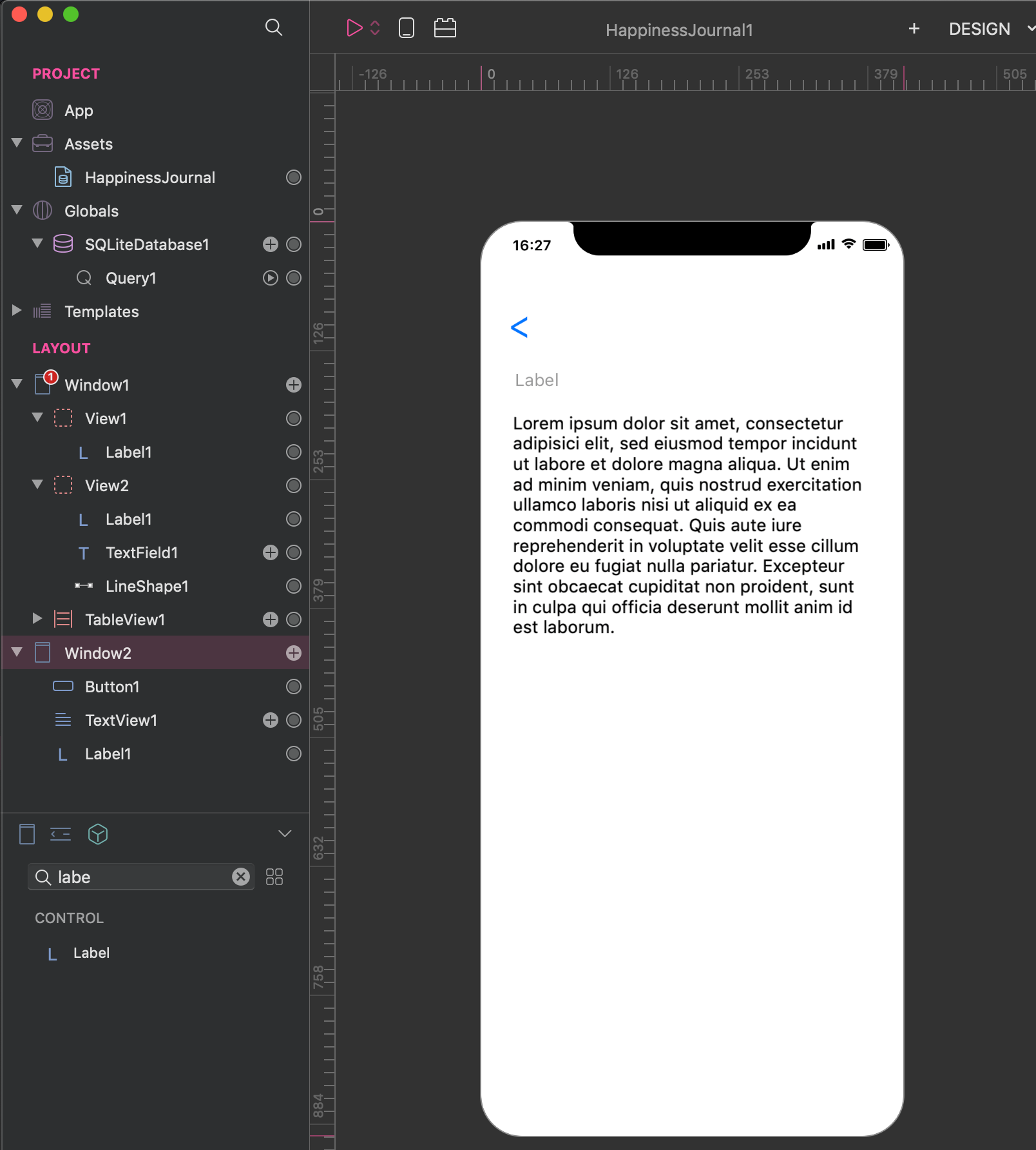That's pretty easy. We add a Window2 container and then we drop a Button—to navigate the user back to the main window—, a Label—to display the logline date —, and a TextView—to display the logline body. I changed a few properties to make it prettier:
