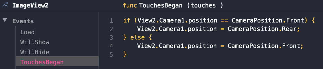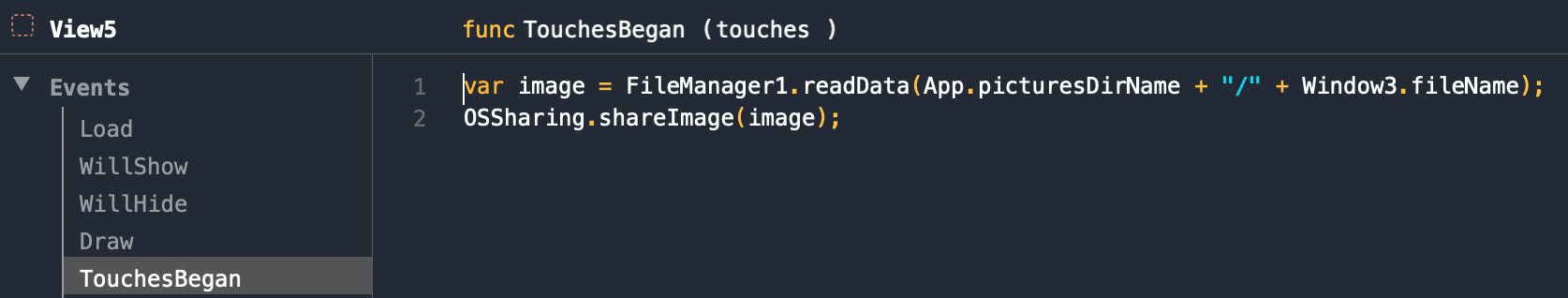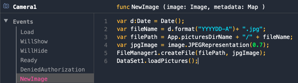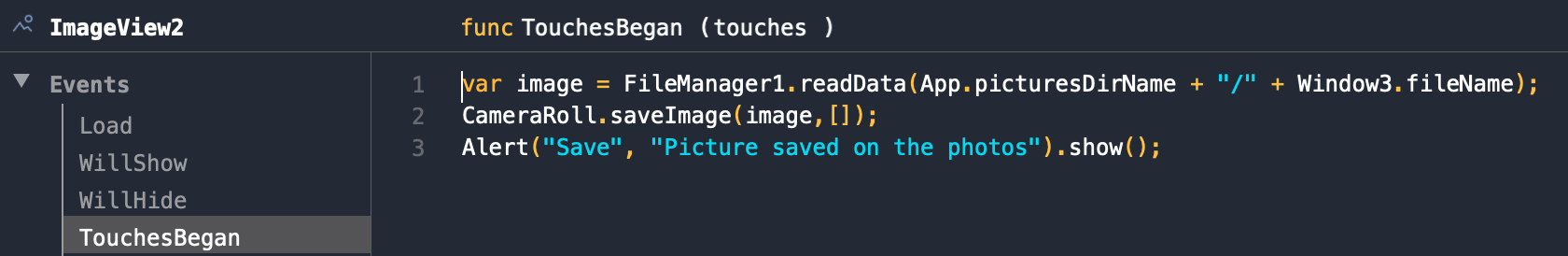 The next step is to take some pictures and store them into the app file system. To store a picture on my device I need to run View2.Camera1.capture() when the Click "button" on Window2 is touched, and save the image file to the file system. I can easily do that, in the NewImage event of Camera1: