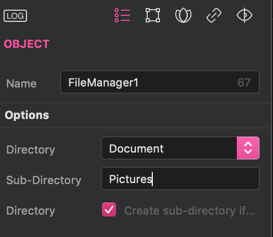 DataSets are incredibly useful: once you fill them up with data. For example, you can bind them to a CollectionView in one click. Let's add a File Manager and DataSet instance to the Global folder. Any object/event in the app can see what's in the Global folder. Now, select FileManager1 object and set its properties in the Object Inspector: