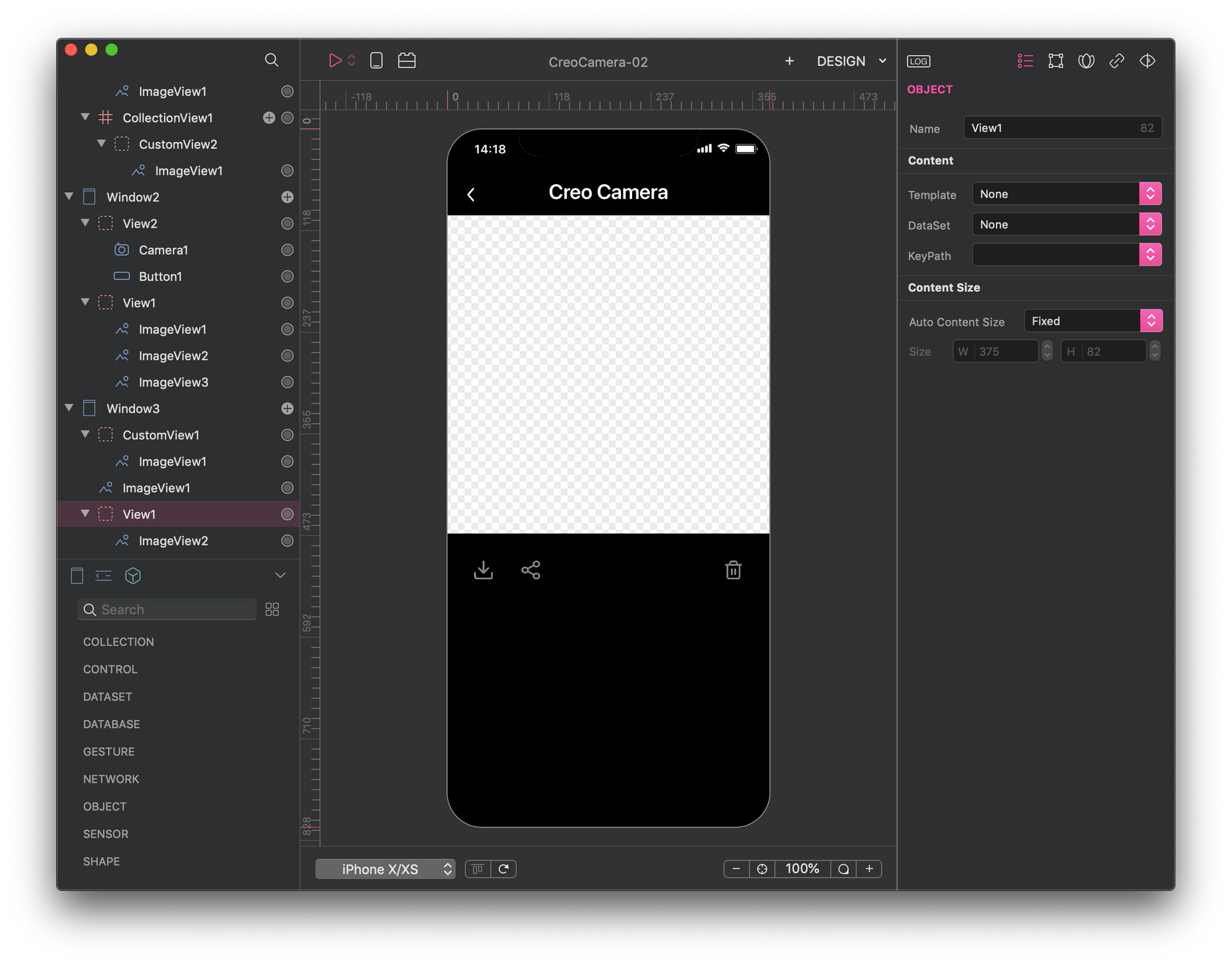 Let's get back to the actions I want to accomplish on the displayed image: I want to save, share and delete it. First of all, I add 3 icons—using ImageViews—to Window3. As usual, I download the icons from Feather Icons, and then I transform SVG files in PNG files—1x, 2x and 3x. I add a View— View1 — to Window3 and I drag and drop three ImageViews onto View1. On each ImageView, I add three PNG files—1x, 2x, 3x. The resulting screen should be like this:
