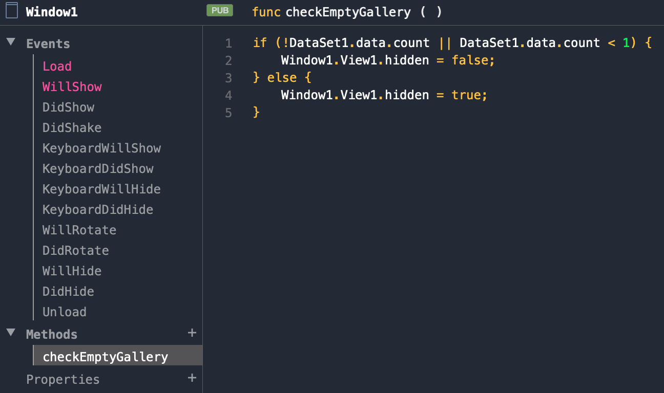 This View— View1 in Window1 container—should be displayed only if the DataSet1.data list is empty. This check has to be done twice in my app: