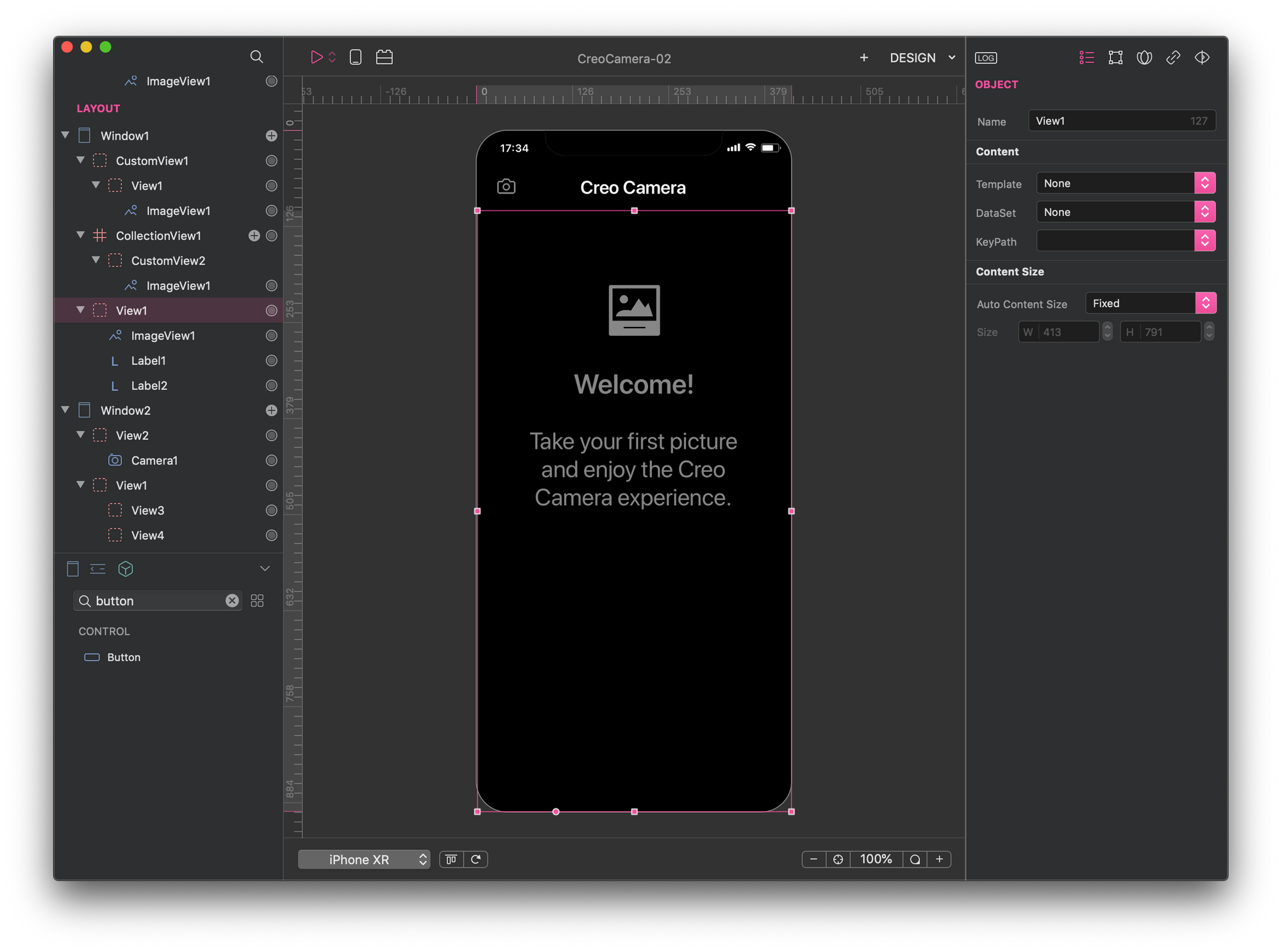 Let' start. I add a new Window—Window2—that shows up touching the camera icon on Window1. This task is similar to what I did in a previous article, so I'll do this quickly. Download this project phase if you want to see how I did the design part. The result is this: