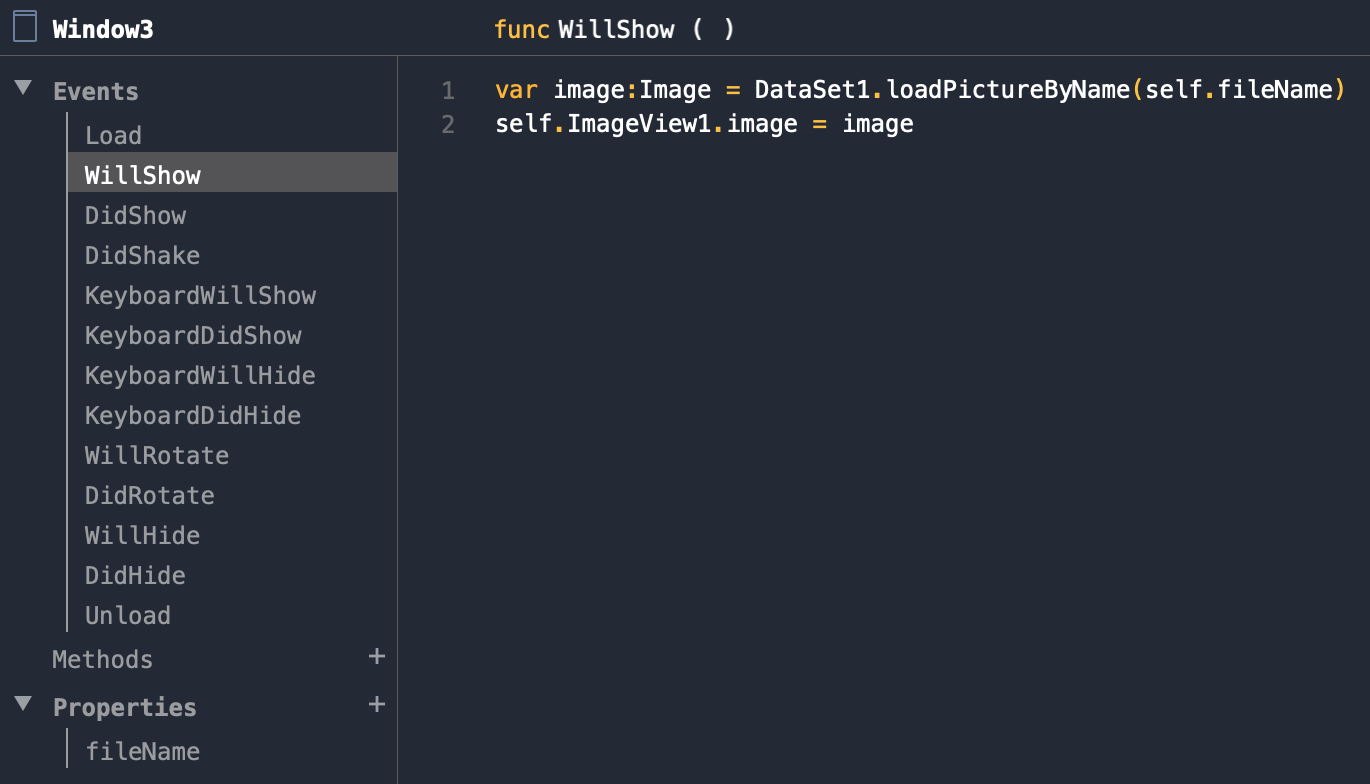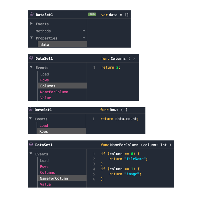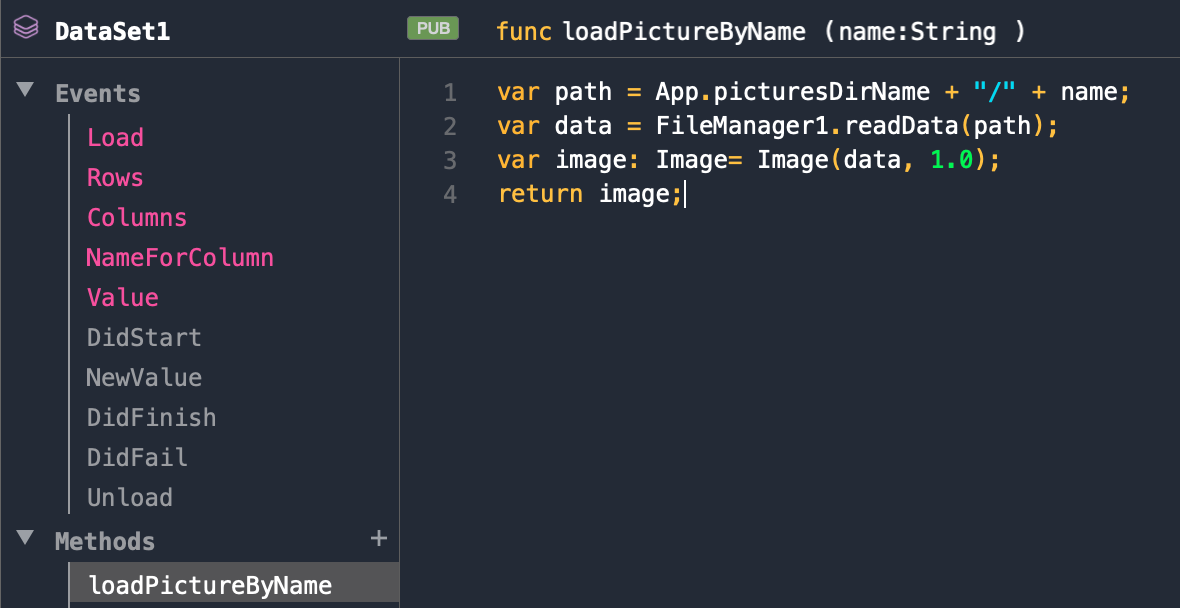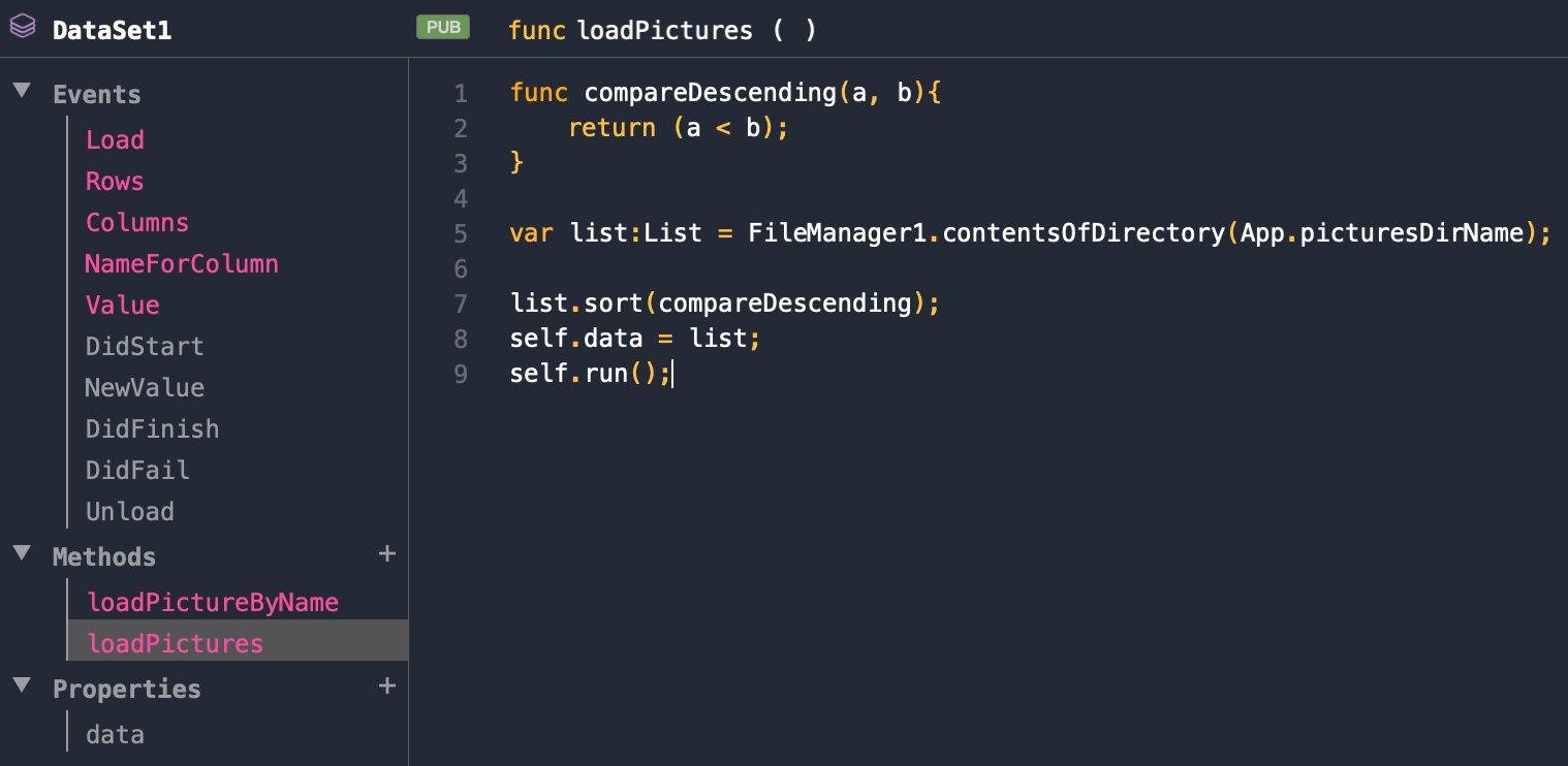 Define a property named picturesDirName in the App object and set its value to "Pictures". Select DataSet1, define a private property data to store filenames, set its Rows, Columns, NameOfColumns consistently: