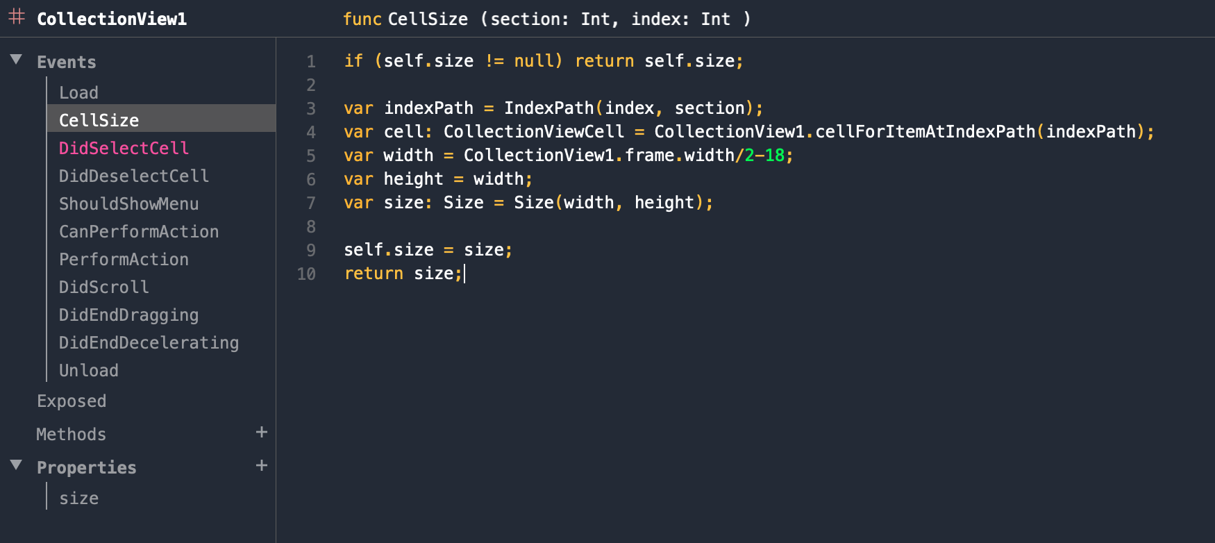 Note that, I don't need to recompute the size for each cell of the CollectionView grid. I only need to do that once. So, I define a size property in the CollectionView, and then I elaborate the cell size only the first time.