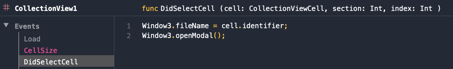 Touching a picture on CollectionView1 I want to show it on Window3. I define one property in Window3—filename—, and I fill it up when a cell gets selected. Remember that the cell.identifier has the picture filename in it: